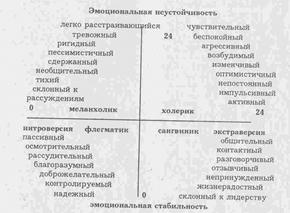 Полученные результаты определяют положение на координатной оси. Согласно результату определяется темперамент испытуемого.